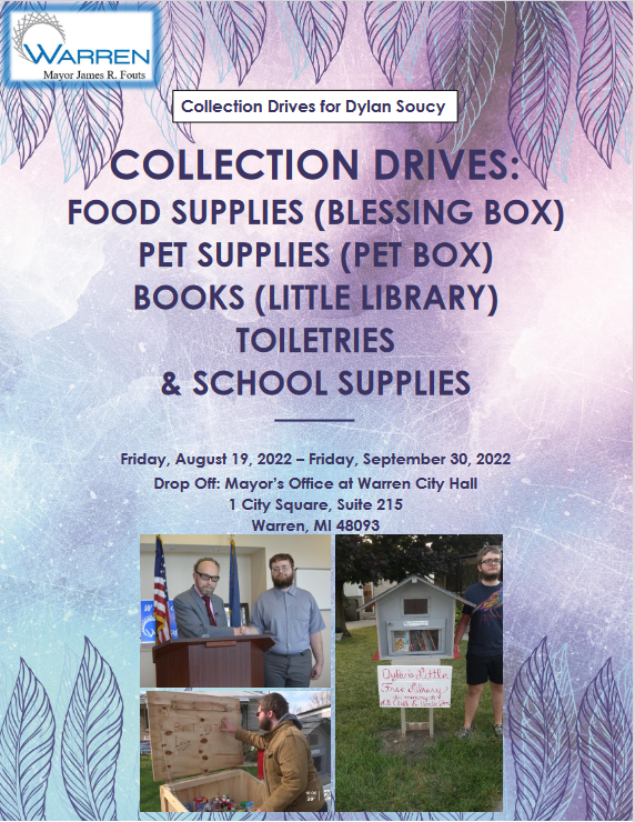 We will be supporting his various drives at Warren City Hall during the month of August throughout the end of September. Please drop off various items including food, books, toiletries, school supplies, and pet supplies at the Mayor’s Office anytime throughout the end of September. Make the end of summer a time to help many who can use a little of Dylan’s blessings!