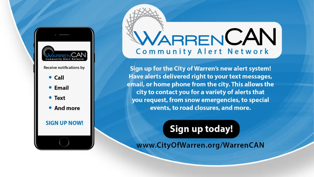 Sign up for the City of Warren’s new alert system! Have alerts delivered right to your text messages, email, or home phone from the city. This allows the city to contact you for a variety of alerts that you request, from snow emergencies, to special events, to road closures, and more. Sign up today here.
